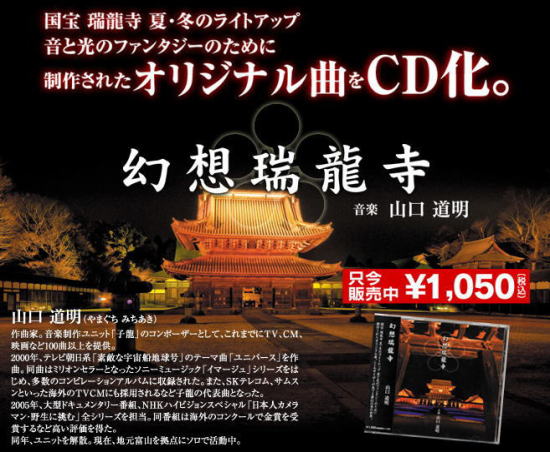 「幻想瑞龍寺 」 音楽 山口 道明 1.幻想瑞龍寺('08夏) 2.菩提寺('09冬) 3.時の雫('09夏) 全3曲 ¥1,050 (税込) お問い合せ 瑞龍寺ライトアップ実行委員会 |
