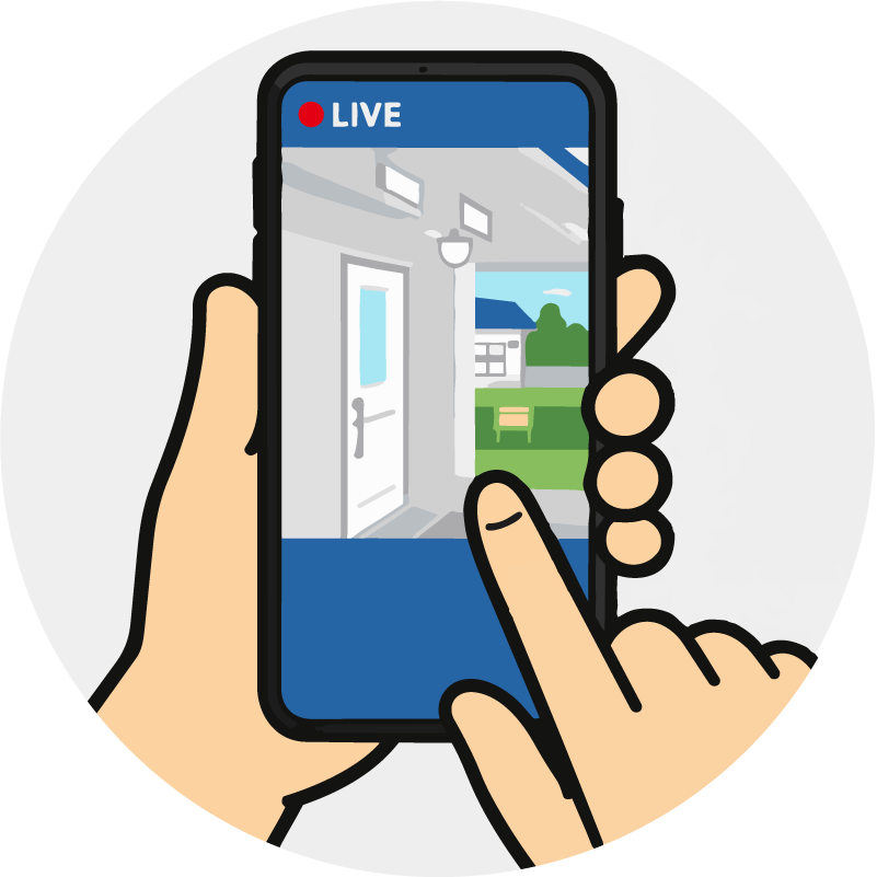 - ※2.カメラ視聴には、スマートフォンならびに専用アプリ(無料)のインストールが必要となります。PC、タブレット端末では視聴不可となります。視聴可能な映像は、ライブ映像とSDカードに録画された過去映像のみとなります。ただし、SDカード録画に設定し容量不足となった場合、録画は古い順から消され、新しいものが上書きされます。