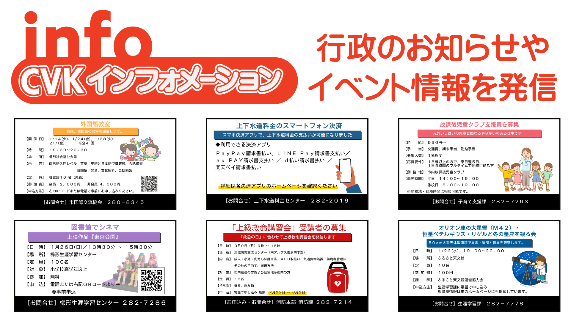 行政からのお知らせや、市内のイベント情報などをスライドでお伝えする、文字情報番組です。